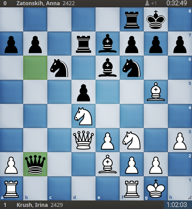 Po tym, jak czarne zbiły pionka 14...Hxb2, białe zagrały 15.Gxf6! forsując mocno osłabiające 15...gxf6, ponieważ czarne musiałyby spotkać 16.Wfb1 z 16...Ha3. Z podwojonymi pionkami na skrzydle królewskim Zatonskih nie była w stanie utrzymać pozycji.