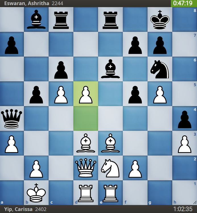 IM Carissa Yip kontynuowała swój dominujący występ, odnosząc czwarte zwycięstwo z rzędu, dzisiaj ogrywając WIM Ashritha Eswaran w Obronie Caro-Kann z roszadami po przeciwnych stronach. Kluczowy moment nadszedł w grze środkowej, kiedy Yip znalazła genialną centralny przełom (22.d5!), który otworzyła pozycję na jej korzyść: